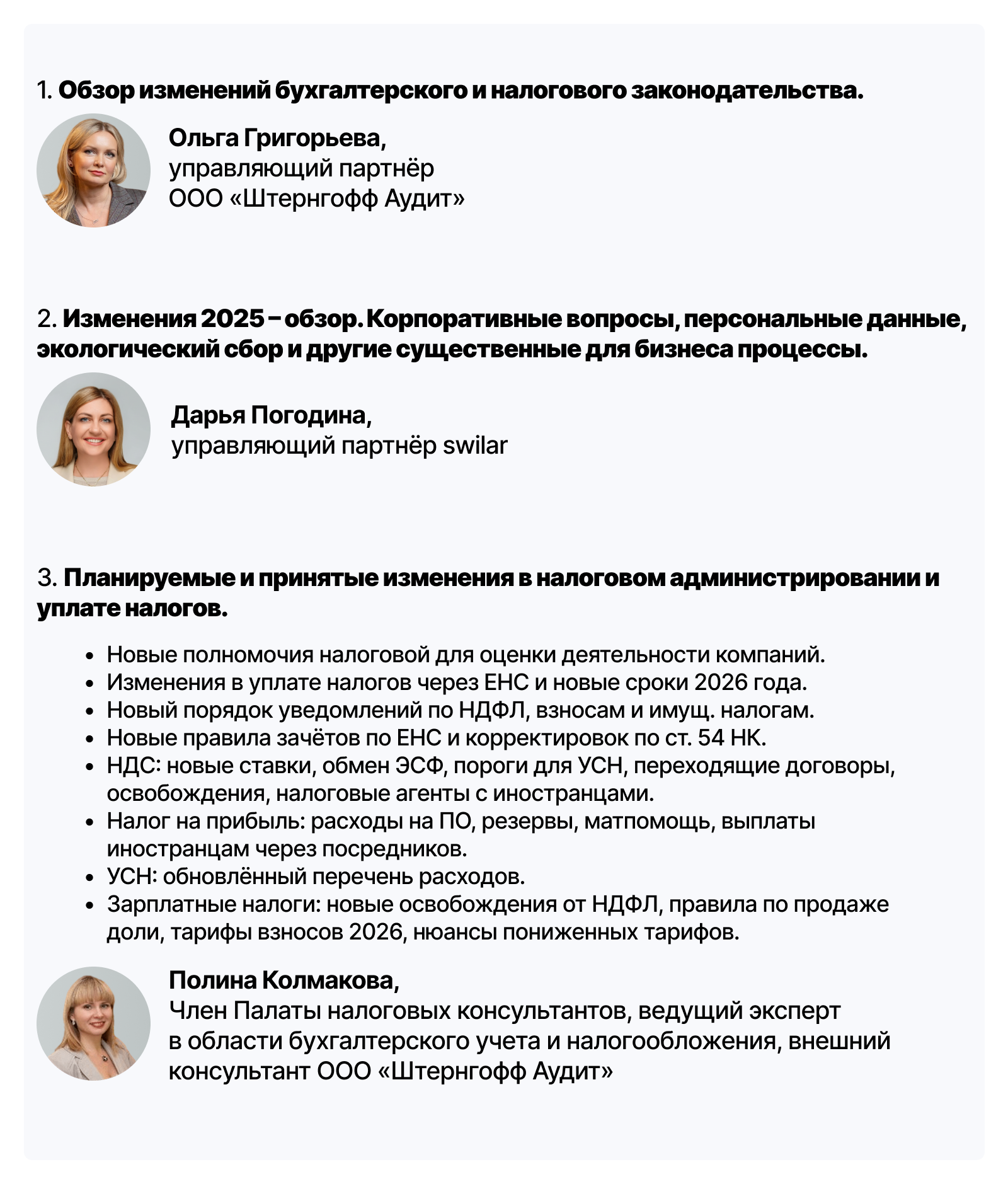 Аудиторская компания Sterngoff Audit совместно с группой компаний swilar приглашают вас на онлайн‑семинар по актуальным изменениям в налоговом администрировании, НДС, налоге на прибыль, УСН и зарплатным налогам, а также ключевым корпоративным изменениям 2025 года: