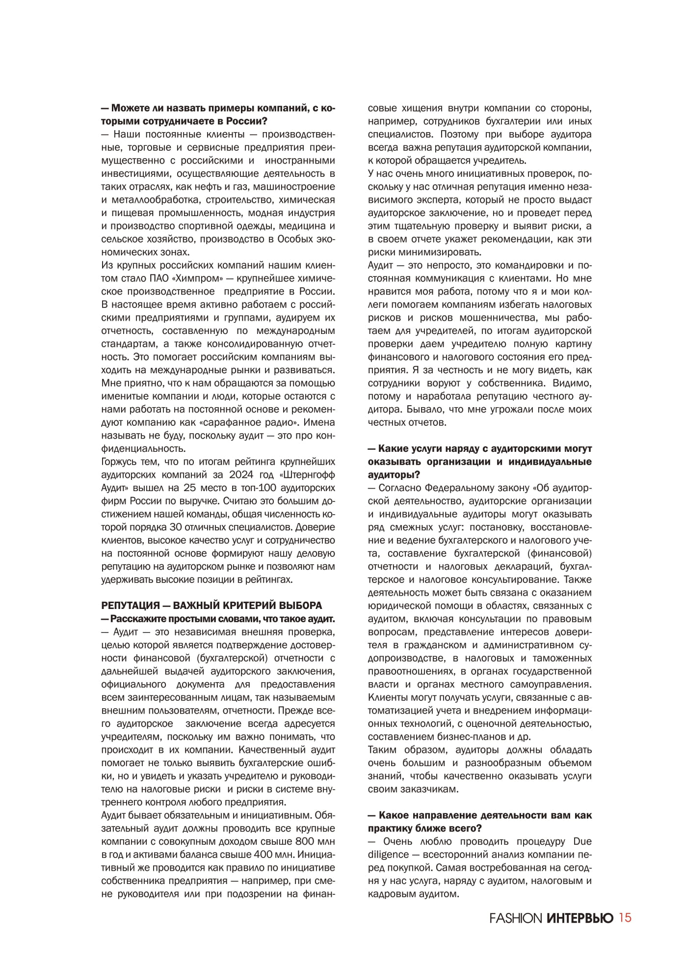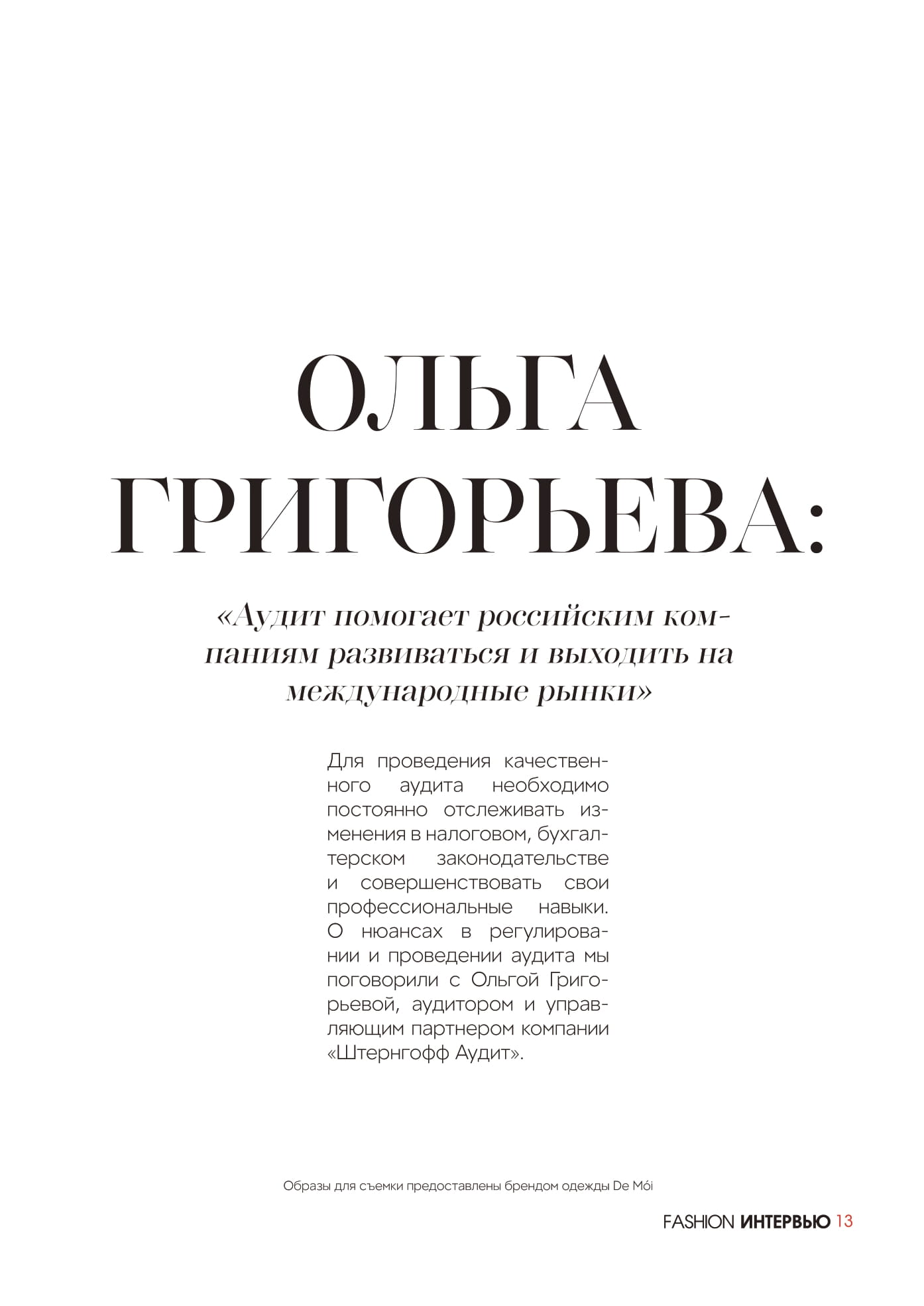 Ольга Григорьева, управляющий партнёр и аудитор Sterngoff Audit, стала героиней интервью в журнале Fashion Magazine. В материале Ольга рассказывает о профессиональном пути, развитии аудиторской практики, роли независимого аудита для бизнеса и значении репутации в профессии.