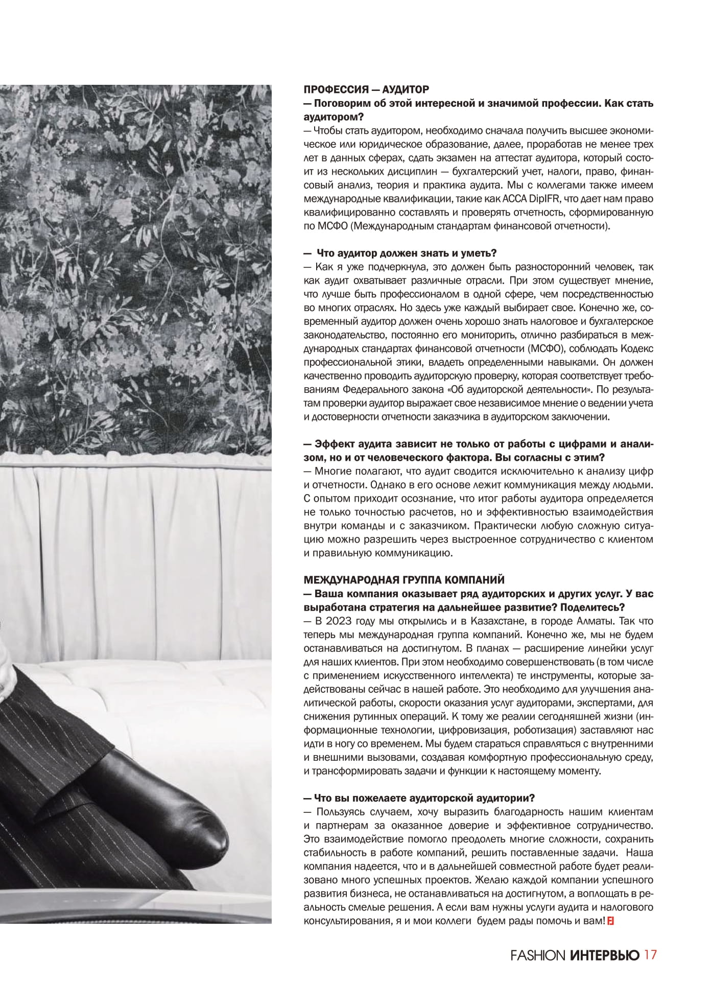 В интервью затронуты темы работы с российскими и международными компаниями, аудита по международным стандартам, инициативных проверок, а также развития аудиторских и консалтинговых услуг в условиях меняющегося законодательства. Отдельное внимание уделено профессии аудитора, требованиям к специалистам и перспективам развития отрасли.