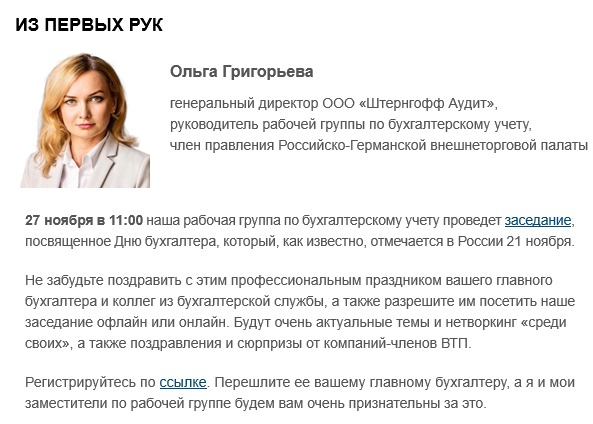 Наш генеральный директор Ольга Григорьева, являясь руководителем данной группы, поздравила всех присутствующих коллег с профессиональным праздником, а коллег собралось более 100 человек. «Я всегда за бухгалтера и за престиж нашей профессии! Ведь главный бухгалтер – это правая рука любого руководителя», – сказала она.